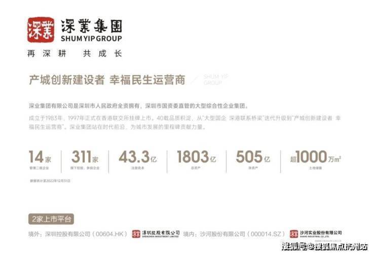 历经40年的发展,目前业务覆盖全国20个省,58个城市,全国项目总量608个,运营项目面积约8257万㎡,连续多年荣获“中国500强企业”、“房地产百强企业”“中国房地产开发企业稳健经营10强”等荣誉。其打造的深业云海湾,是2023年全国唯一单日销售额破100亿的项目。